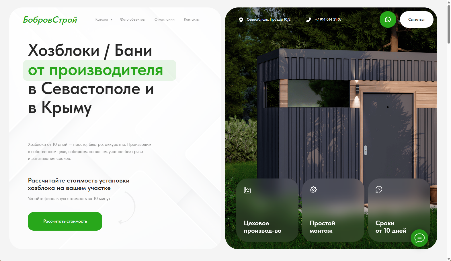 - Кнопки призыва к действию ("Рассчитать стоимость", "Связаться")